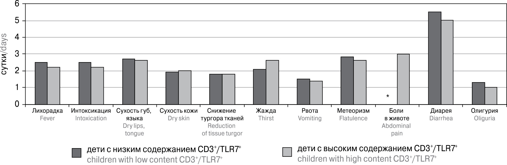 Продолжительность инфузионной терапии оказалась у детей с низким содержанием иммунокомпетентных клеток, экспрессирующих TLR7, почти на сутки дольше относительно пациентов с высоким их содержанием — 2,9 (2,5–3,3) против 2,0 (1,1–2,9) суток (различия недостоверны). При этом антибактериальные средства были добавлены на 2,5 (1,8–3,2) сутки к комплексному лечению, включающему интерферонотерапию, только детям с низким содержанием CD3+/TLR7+ из-за развития микст-инфекции за счет присоединения бактериальных возбудителей, о чем свидетельствовало появление в стуле примесей зелени и слизи (р < 0,05 по χ2 критерию Пирсона и критерию Манна–Уитни).