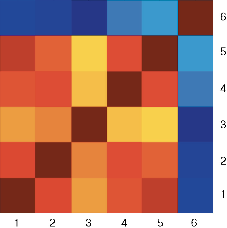 Note. Mass spectrums of bacterial strains are located along the Y-axis (vertical line) from bottom to top of the dendrogram, along the X-axis (horizontal lines) from left to right of the dendrogram. The color of the cell reflects the degree of affinity of the corresponding strain pair. The range of cell colors corresponds to the thermal imaging scale from dark blue (with absolute difference in strains) to dark red (with complete coincidence).