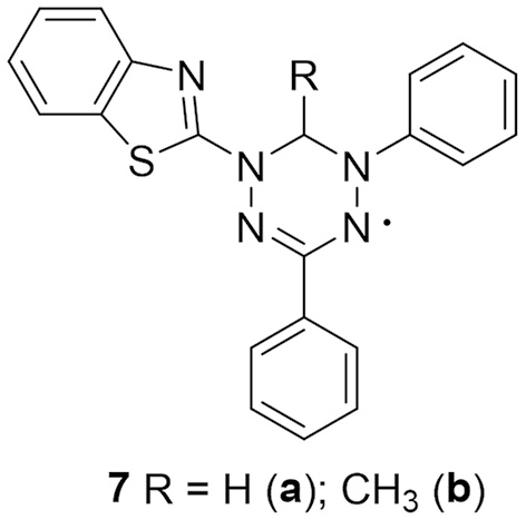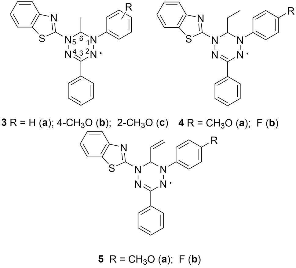 Figure 2. Structures of 6-alkyl-5-aryl-1-(benzo[d]thiazol-2-yl)-3-phenylverdazyls and 5-aryl-1-(benzo[d]thiazol-2-yl)-3-phenyl-6-vinylverdazyls used in the study