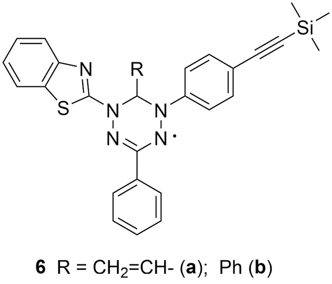 The Ethynyl derivatives (Fig. 3) were synthesized from 5-(benzothiazol-2-yl)-1-(4-iodophenyl)-3-phenyl-6-vinyl(phenyl)verdazyls using Sonogashira cross-coupling reactions carried out in two stages according to a previously published method [16].