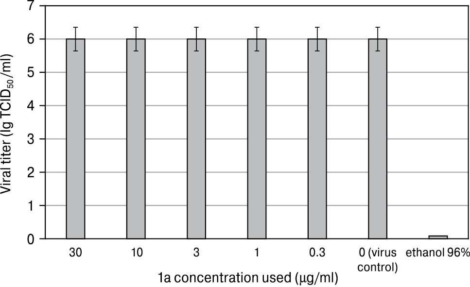 To confirm virus-inhibition activity of 1a, we performed a viral yield reduction test. As described above, this test measures the titer of viral progeny in the supernatant of the infected culture depending on the compound concentration. Therefore, it is possible to evaluate antiviral activity of the compounds. The results of viral yield reduction assay are summarized in the Fig. 5 below.