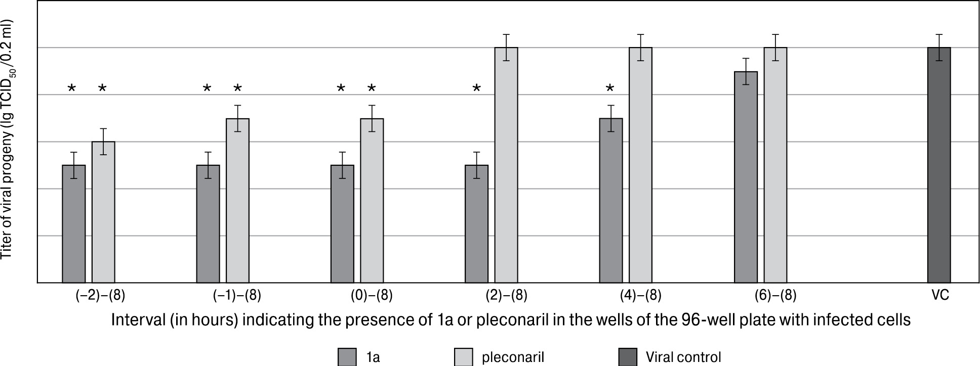 As can be seen from the data presented, the most pronounced effect of 1a was reached when it was present in the culture medium from –2 to 4 h post-infection (hpi). Inhibitory effect was absent after 4 hpi time point. Pleconaril used as a reference compound was mostly active from –1 point till 1 hpi as expected according to its capsid-binder characteristics. It belongs to the capsid binder group of antivirals which interact with various depressions on the surface of enteroviral capsid [5]. This interaction leads to stabilization of virus particles and prevents them from penetrating the cell.