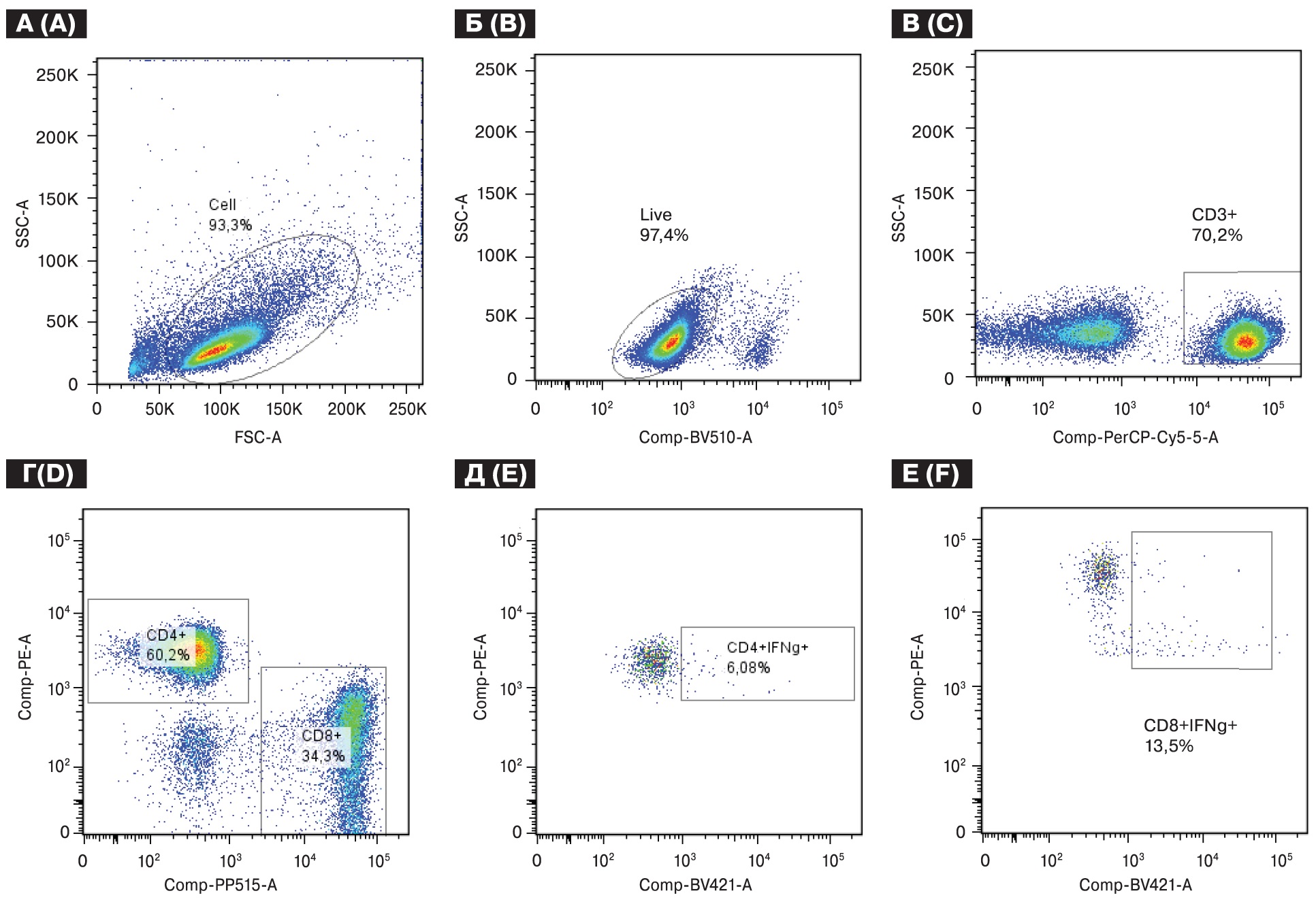 Note. A — cells; B — live/dead; C — CD3 positive; D — CD4+ and CD8+; E — CD4-IFN³-positive; F — CD8-IFN³-positive.