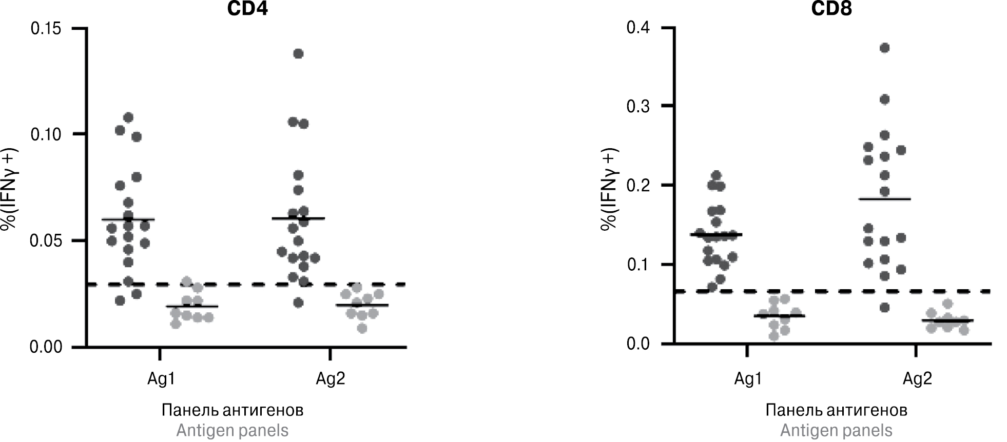 Рисунок 2. Результаты определения процентного содержания продуцентов IFNγ среди CD4-позитивных (слева) и CD8-позитивных (справа) Т-клеток при исследовании образцов МКПК от иммунных (темные маркеры) и неиммунных (светлые маркеры) доноров с использованием панелей АГ1 и АГ2 антигенов вируса SARS-CoV-2