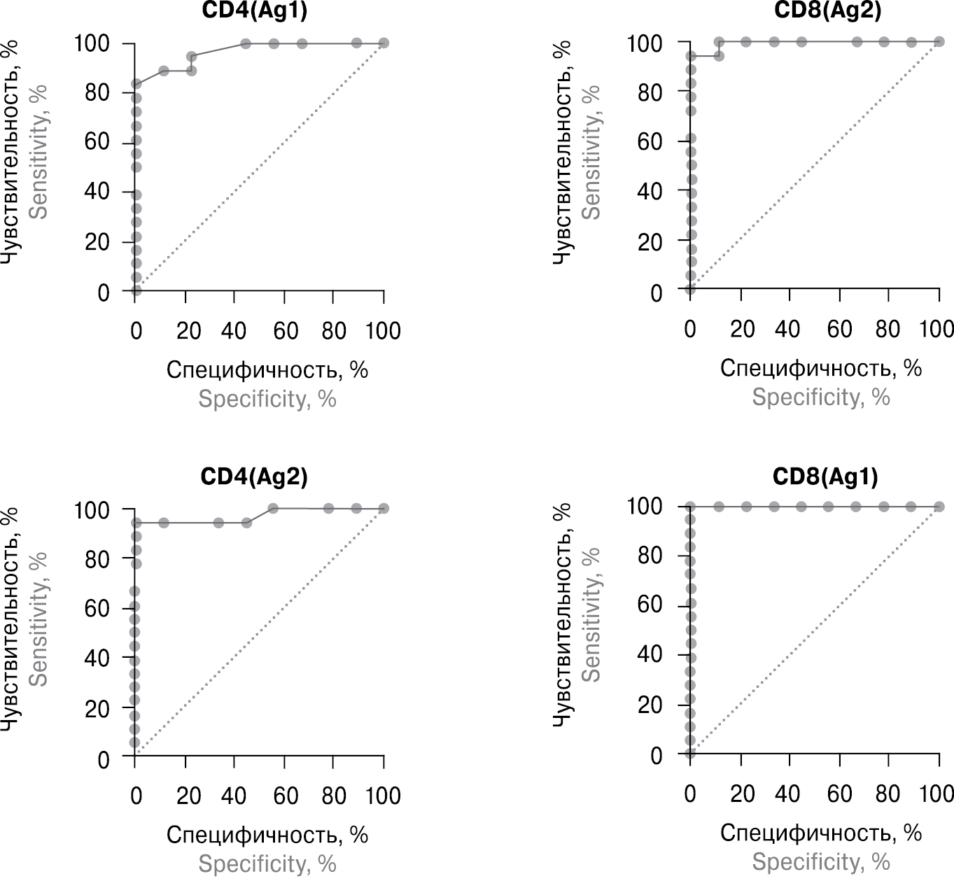 При исследовании материала от интактных и переболевших доноров с использованием панелей АГ1 и АГ2 антигенов вируса SARS-CoV-2 определяли процентное содержание продуцентов IFNγ среди CD4- и CD8-позитивных Т-клеток. Далее применяли ROC-анализ [1, 29] и определяли для каждой из двух популяций значения AUC (площади, ограниченной ROC-кривой и осью ложноположительных классификаций). Информативность метода считалась приемлемой при условии, что AUC составляла не менее 0,7.