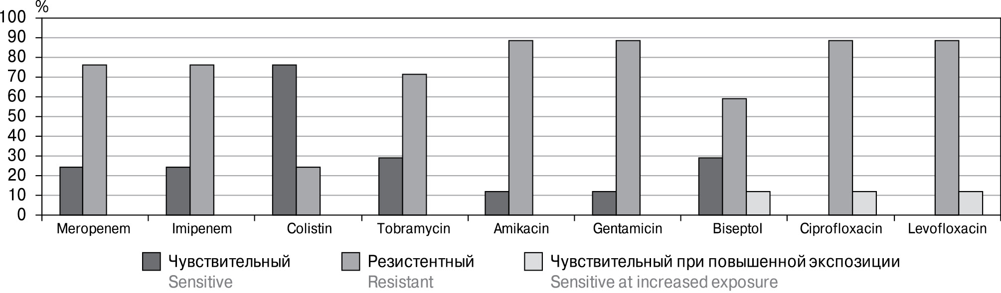 Для карбапенемов резистентность составила 76% (n = 13). К аминогликозидам резистентность проявили от 71 до 88% изолятов. К фторхинолонам были резистентны 88% (n = 15) штаммов. К бисептолу проявили резистентность чуть более половины изолятов — 59% (n = 10).