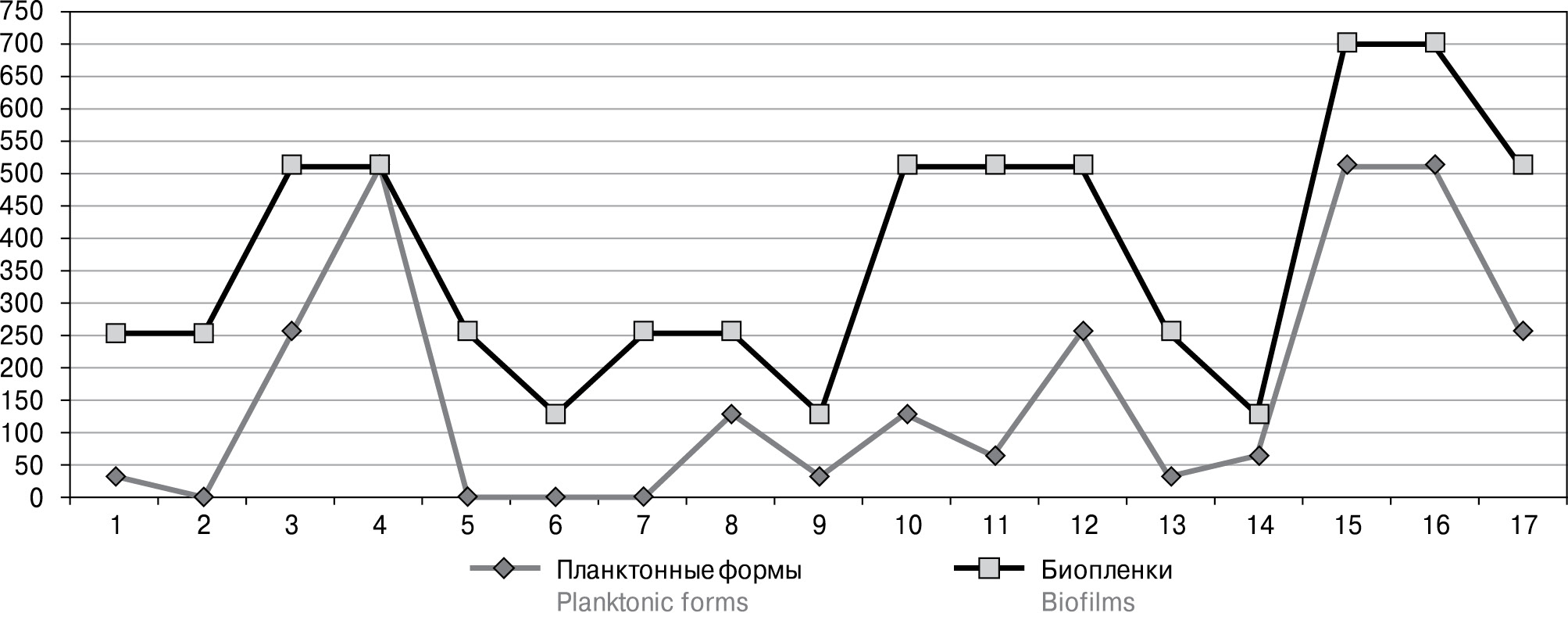 Статистический анализ показал, что МПК меропенема для биопленочных форм культур значимо выше, чем МПК меропенема для планктонных форм тех же штаммов (р < 0,05). МПК меропенема для планктонных клеток распределялись от 0,5 до 512 мг/л, в то время как эти же микроорганизмы в биопленках имели МПК меропенема in vitro в концентрациях от 128 до 512 мг/л и выше. Было определено, что у изолятов, проявлявших способность к образованию слабых биопленок, МПК меропенема для бактериальных клеток в составе биопленок превышали МПК для планктонных клеток от двух до восьми раз. Для штаммов, способных к образованию умеренных и сильных биопленок превышение подавляющих концентраций достигало 512 раз (0,5 мг/л для планктонных и 256 мг/л для клеток в составе биопленок).