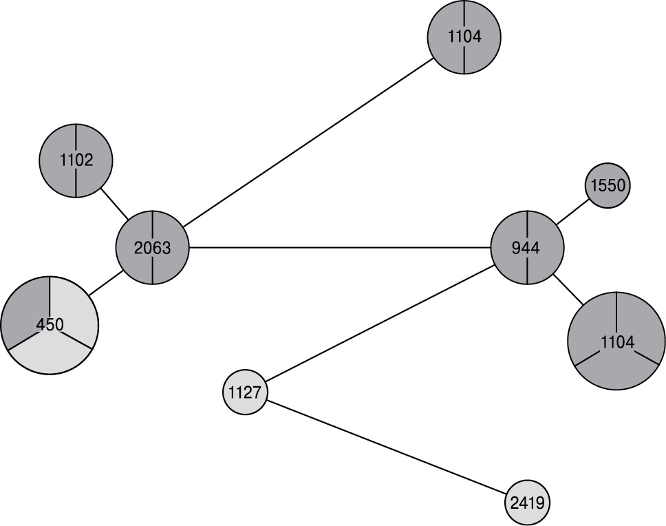 Генотипы ST944Oxf, ST1127Oxf, ST1104Oxf, ST1550Oxf, ST450Oxf, ST2419Oxf встречались только в С1, генотип ST2063Oxf — только в С2, а генотипы ST1100Oxf и ST1102Oxf выделялись в обоих стационарах с одинаковой частотой.