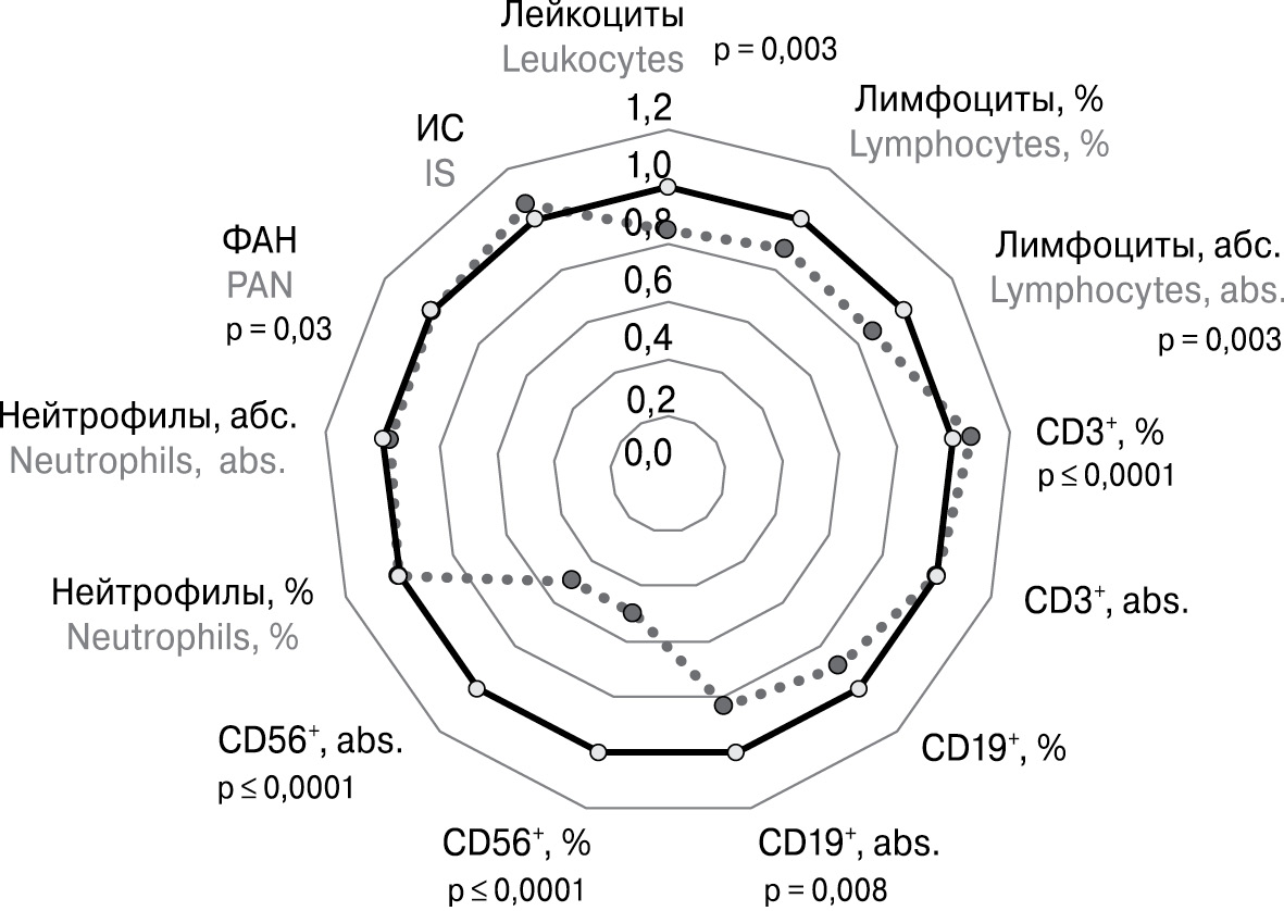 В периферической крови оценивали общее число лейкоцитов, лимфоцитов и нейтрофилов на гематологическом анализаторе System XS 800i. Субпопуляционный состав лимфоцитов проводили по следующим маркерам дифференцировки: CD45+, CD3+, CD56+, CD19+ с использованием моноклональных антител CYTO-STAT (Beckman Coulter, США). Фагоцитарную активность нейтрофилов и окислительного взрыва определяли, используя набор FagoFlowEX Kit (EXBIO, Чехия), анализы проводили на проточном цитофлуориметре Gallios (Beckman Coulter, США).
