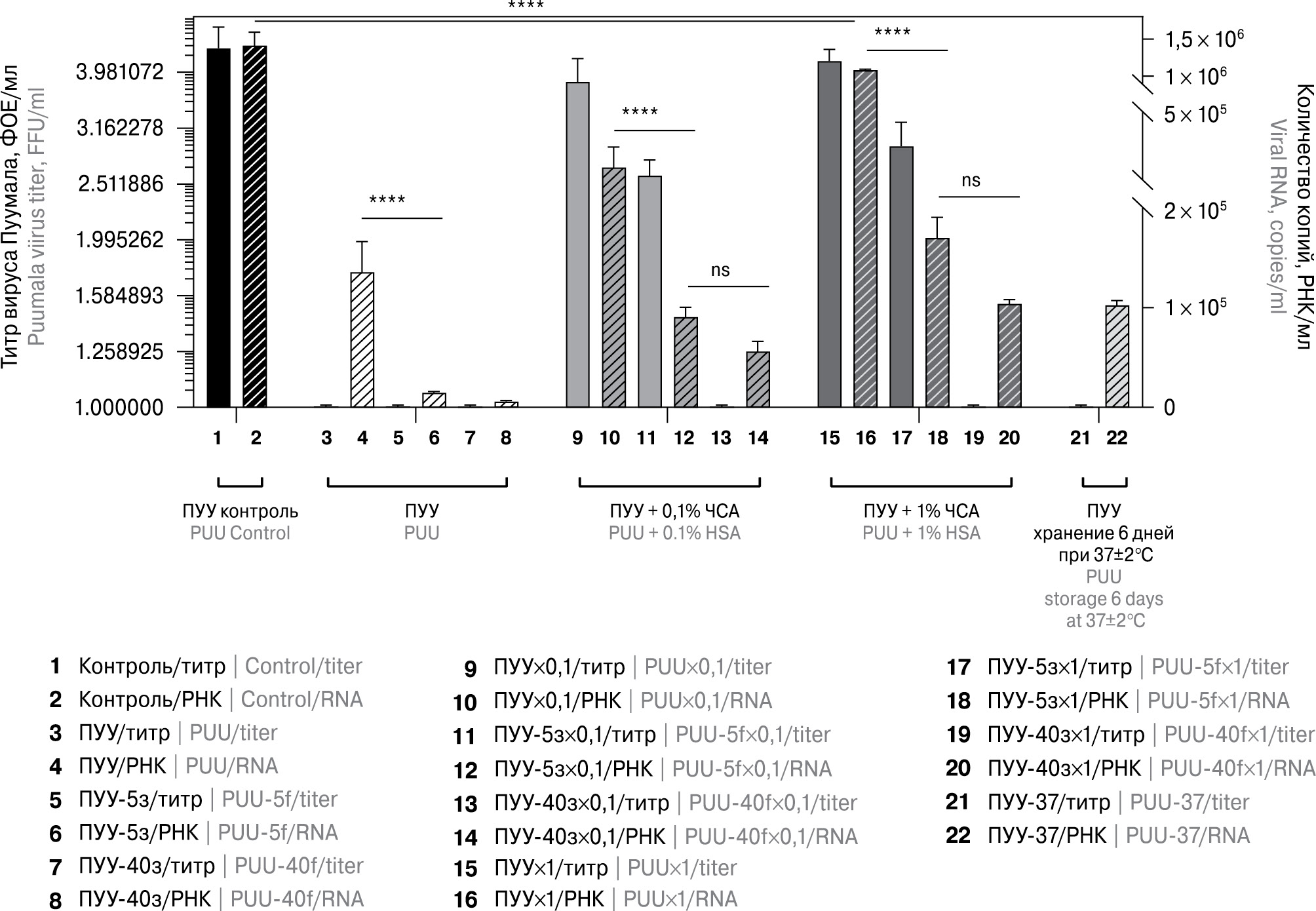 Исследования подтвердили факт потери вирулентной и иммуногенной активности вируса Пуумала при термоинактивации, а также установили влияние условий хранения на детектируемые уровни вирусной РНК. Установлена прямая корреляция между титром вируса и количеством копий РНК/мл. Эта зависимость сохранялась и при снижении титра вируса в результате хранения. Добавление даже 0,1% ЧСА приводило к менее значительному снижению титра вируса и количества копий РНК. Добавление ЧСА к инактивированному вирусу приводило к стабилизации иммунного ответа, а также способствовало стабилизации вирусной РНК на разных этапах хранения И-ПУУ, включая многократное замораживание. Можно предполагать, что белковые эпитопы, ответственные за протективный иммунный ответ, претерпевают менее выраженные конформационные изменения в присутствии ЧСА.