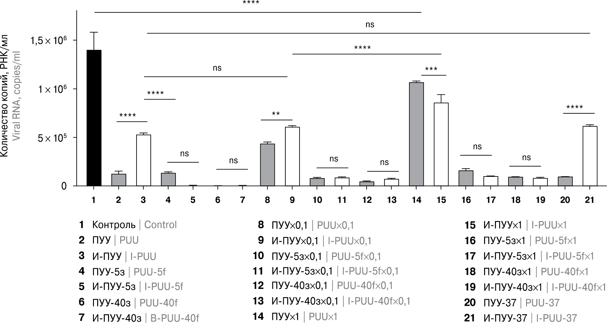 Контроль на остаточную инфекционность И-ПУУ оценивали в трех последовательных пассажах методами флюоресцирующих антител (МФА) [1], титрованием фокусобразующих единиц (ФОЕ) [6] и определением вирусной РНК в полимеразной цепной реакции с обратной транскрипцией в реальном времени (ОТ-ПЦР-РВ) [7]. Иммуногенную активность И-ПУУ оценивали на самках сирийских хомяков в возрасте 2 недель и весом 48±0,3 г. Согласно утвержденному на Этическом комитете заключению, данное исследование соответствует положениям Хельсинской декларации и не нарушает биоэтических правил обращения с животными, участвующими в экспериментах (выписка № 100622-5 от 10.06.2022 г.). Самки хомяков были рандомизированно распределены по 6 особей в каждой группе. Образцы И-ПУУ вводили по 200 мкл в мышечную ткань бедра по схеме: 2 иммунизации с двухнедельным интервалом. Через 14 дней после второй иммунизации все животные были подвергнуты эвтаназии путем декапитации после введения в наркоз сначала стандартной дозой комбинации препаратов Золетил-Ксила [Золетил (10 мг/кг) + Ксила (1 мг/кг)], а затем тройной дозой этих препаратов. Сыворотки крови животных трехкратно исследовали в реакции нейтрализации в клеточной культуре Vero. Результат представлен в виде среднегеометрического значения титра (СГТ) нейтрализующих антител (нАТ) в двоичных логарифмах по 50% редукции числа фокусобразующих единиц (РН/ФОЕ/50). Для количественной оценки РНК в образцах хантавирусного препарата использовали ПЦР в режиме реального времени со штаммоспецифичными праймерами Ufa_F, Ufa_R, и зондом Ufa_Z. Количественное содержание живого вируса ПУУ оценивали по титру вируса методом определения числа фокусобразующих единиц в культуре клеток Vero. Результаты обработаны и проанализированы в программе GraphPad Prism 8.4.3. Представленные усредненные данные являются результатом трех независимых экспериментов, статистически обработанных с использованием одностороннего ANOVA с тестом множественных сравнений Тьюки: ns — не значима, *p < 0,05, **p < 0,01, ***p < 0,005, ****p < 0,0001.