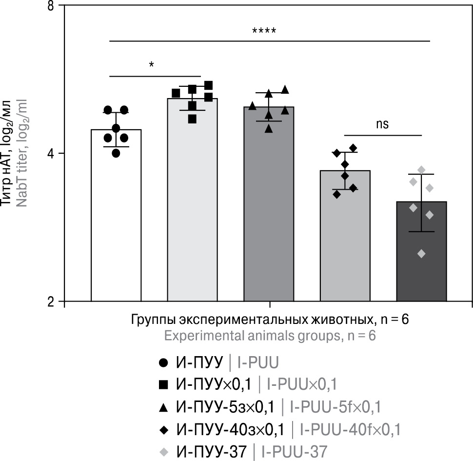 Для оценки влияния человеческого сывороточного альбумина на иммуногенную активностьИ-ПУУ была выбрана концентрация 0,1%. На модели сирийских хомяков (рис. 3) были показаны значительные различия в иммуногенной активности пяти вариантов хранения И-ПУУ: 3 месяца при 6±2°С без добавок (И-ПУУ); 3 месяца при 6±2°С с добавлением 0,1% ЧСА (И-ПУУ-0,1) или после 5-кратной заморозки (И-ПУУ-5з × 0,1), или после 40-кратной заморозки (И-ПУУ-40з × 0,1); 6 суток при 37°С (И-ПУУ-37). Более высокий титр нАТ отмечен при добавлении 0,1% человеческого сывороточного альбумина (p = 0,0152). При этом статистически значимых различий в титре нАТ между группами И-ПУУ и И-ПУУ-5з × 0,1 выявлено не было. И-ПУУ, хранившийся 6 дней при 37°С, обладал меньшей иммуногенной активностью (СГТ = 3±0,5 log2) в сравнении с И-ПУУ (p < 0,0001), что свидетельствует о значительном термическом разрушении иммуногенных эпитопов, сопровождающемся и значительным повреждением вирусной РНК. Также достоверно более низкий уровень нАТ определялся в группе после иммунизации И-ПУУ-40з × 0,1 в сравнении с И-ПУУ (p < 0,0001). Таким образом, наблюдалась прямая зависимость между повреждением вирусной РНК в результате термического воздействия при хранении и уровнем иммуногенной активности для И-ПУУ-37 и И-ПУУ-40з × 0,1.
