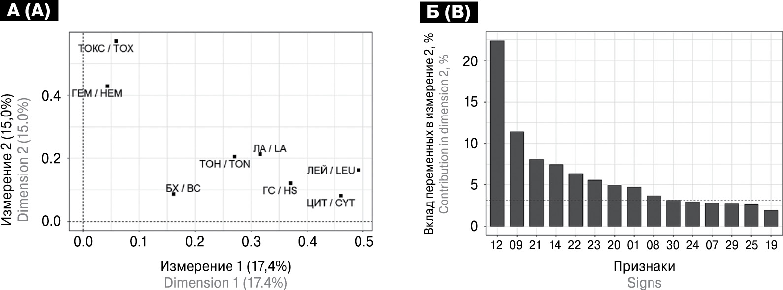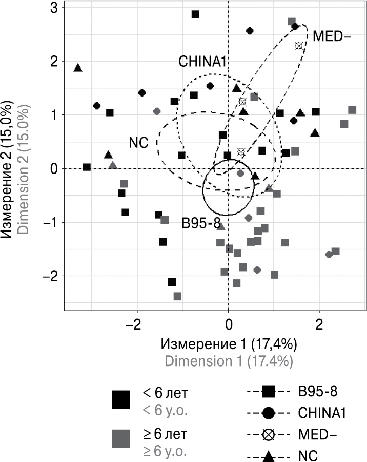 Для оценки комплекса анализируемых признаков применяли множественный факторный анализ (Multiple Factor Analysis, МФА) [27]. При этом использовали два первых измерения (две первые компоненты), суммарно объясняющих 32,36% дисперсии. Значимость переменных групп признаков и каждого признака по отдельности оценивали, анализируя их вклад (contribution). Значимыми считали переменные, чей вклад в компоненты превышал средний рассчитанный (вклад, который делала бы каждая переменная при условии равенства их значимости). Незначимые переменные из дальнейшего анализа исключали.