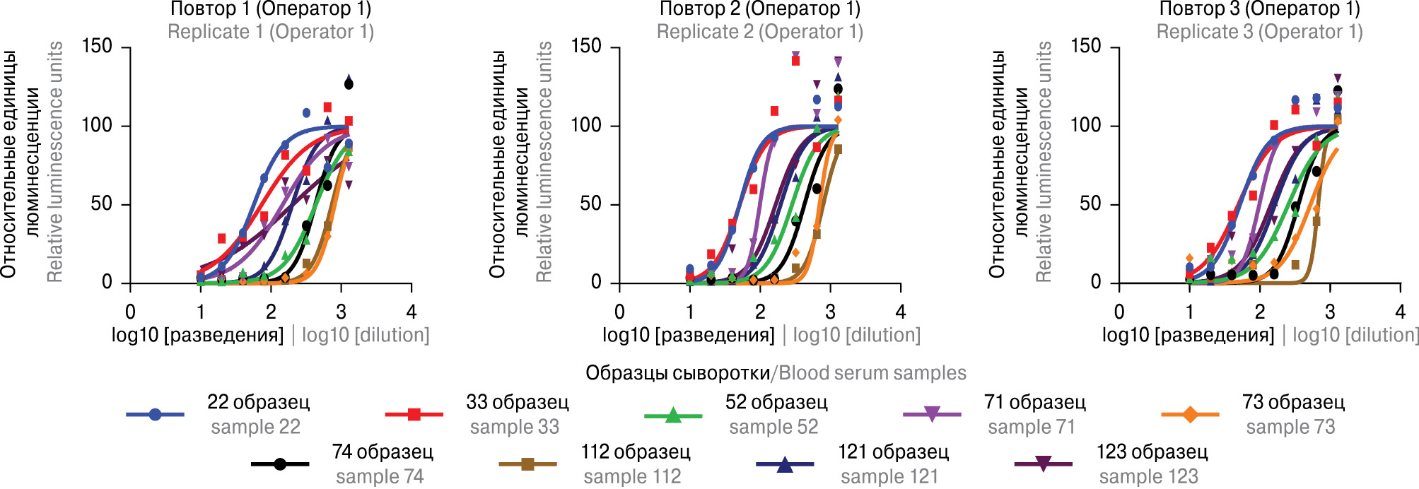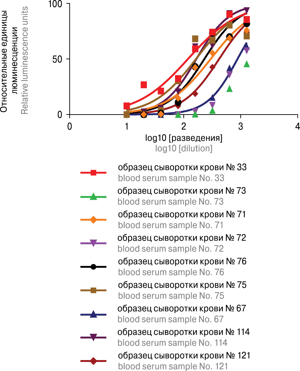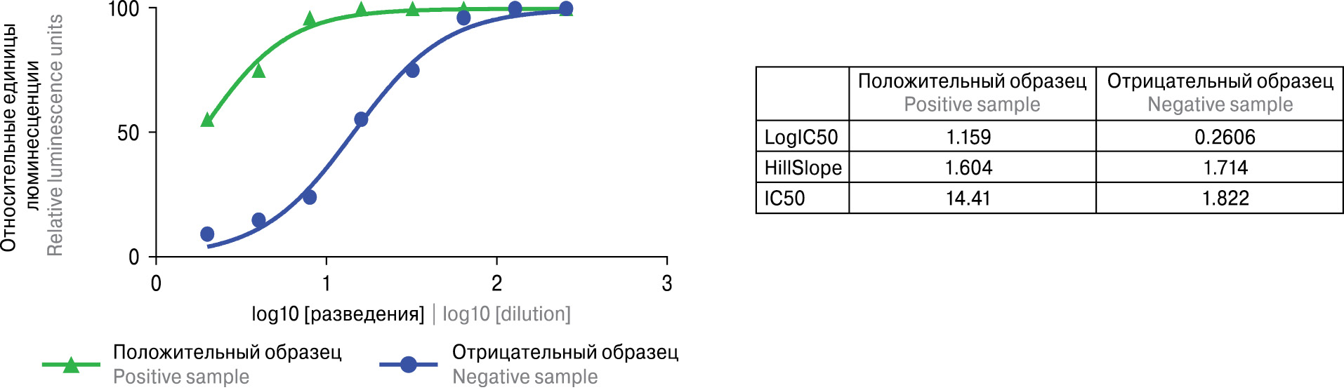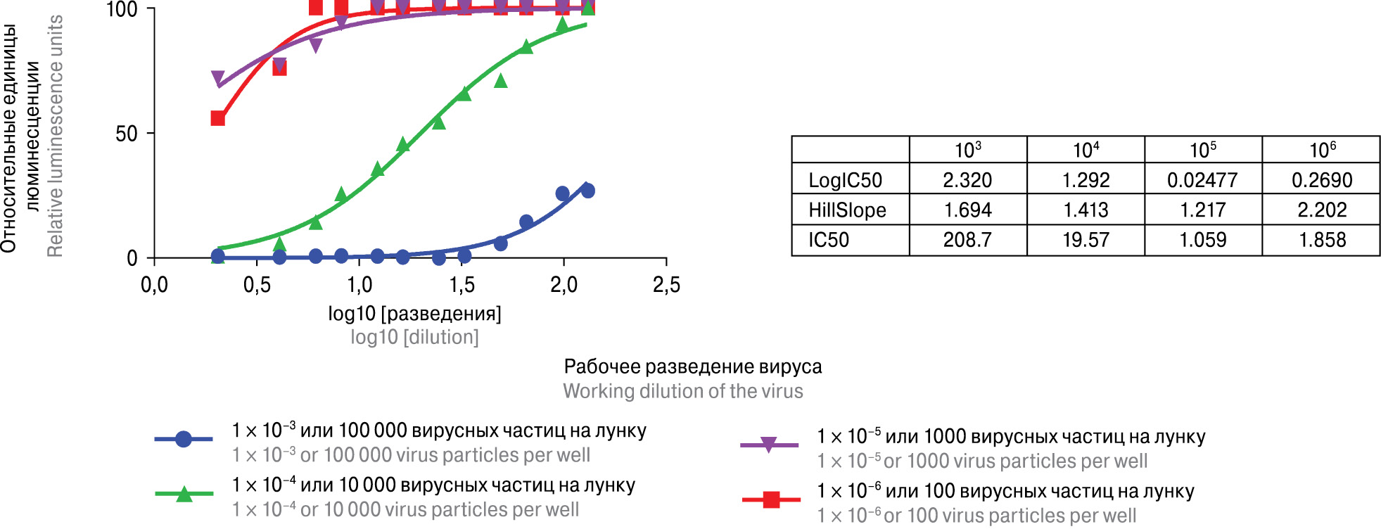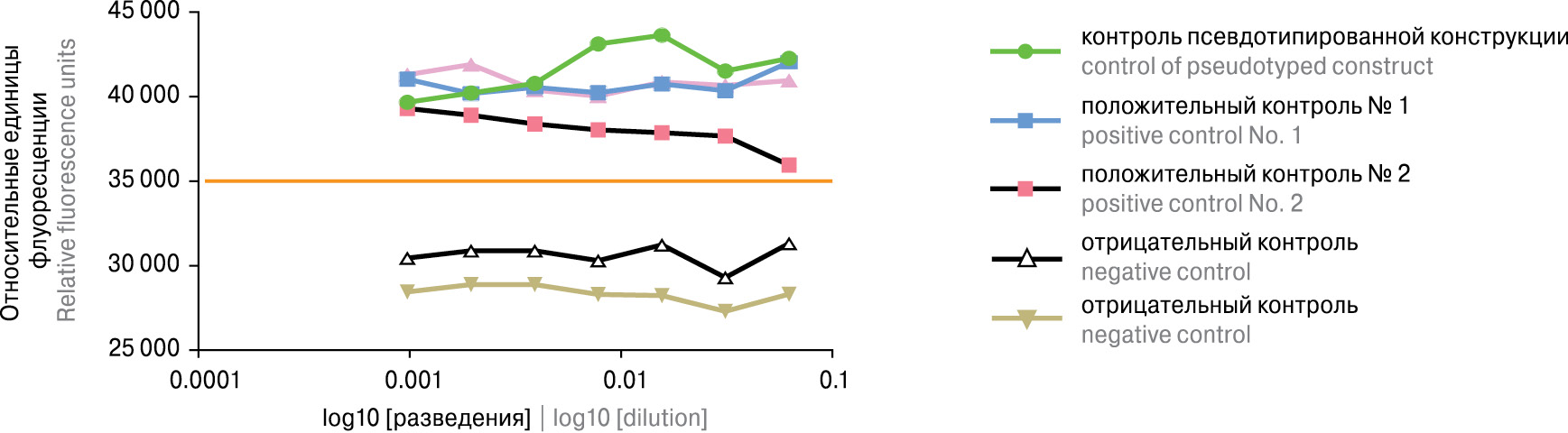 Данные значений относительных единиц люминесценции (RLU) контроля вируса и контроля клеток переводили в среднее значение (n = 8), а полученные усредненные данные — в процентное отношение. Протокол принимал за положительное значение (100%) данные, полученные в ряду с вирусным материалом, а за отрицательное значение (0%) — данные, полученные в ряду с контролем клеток.