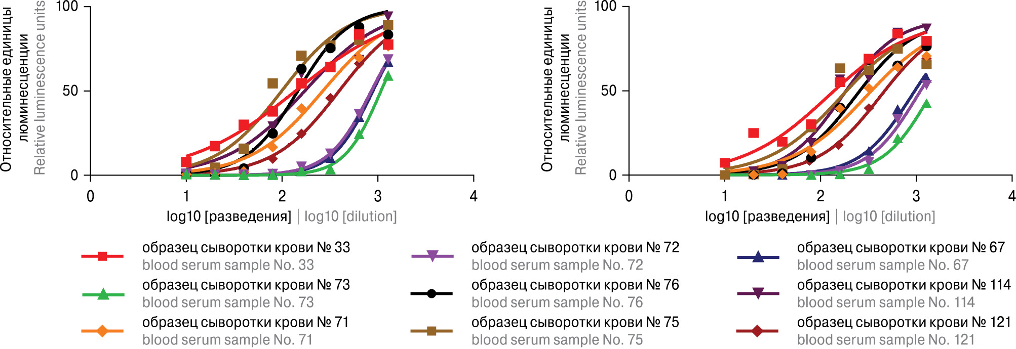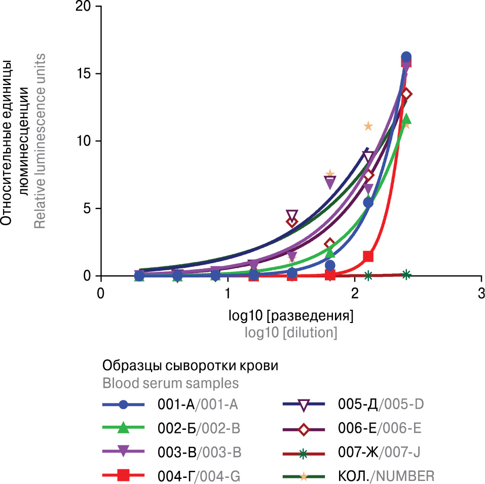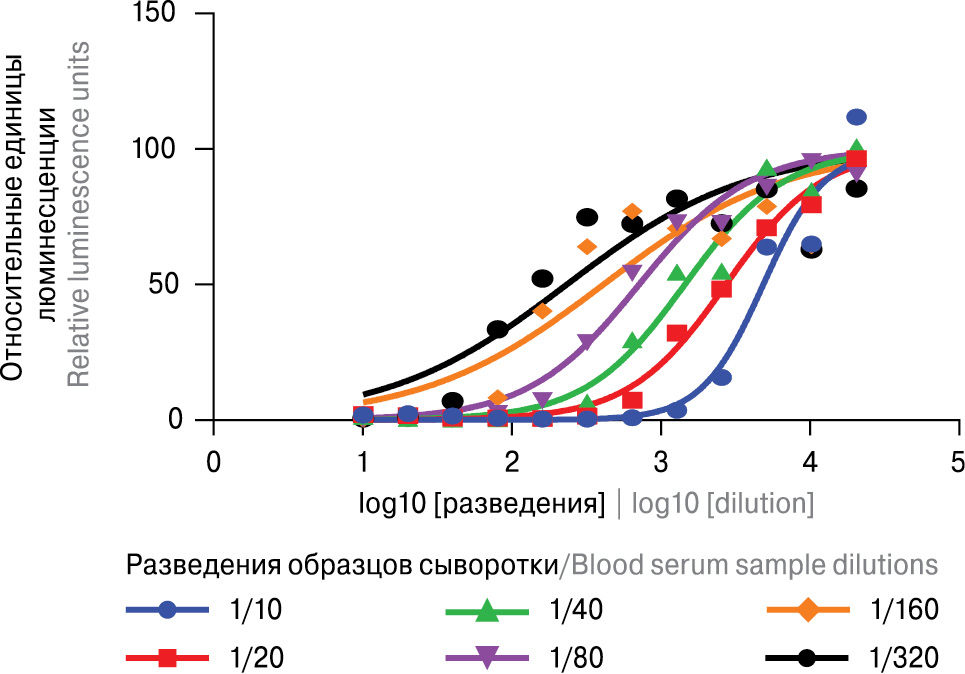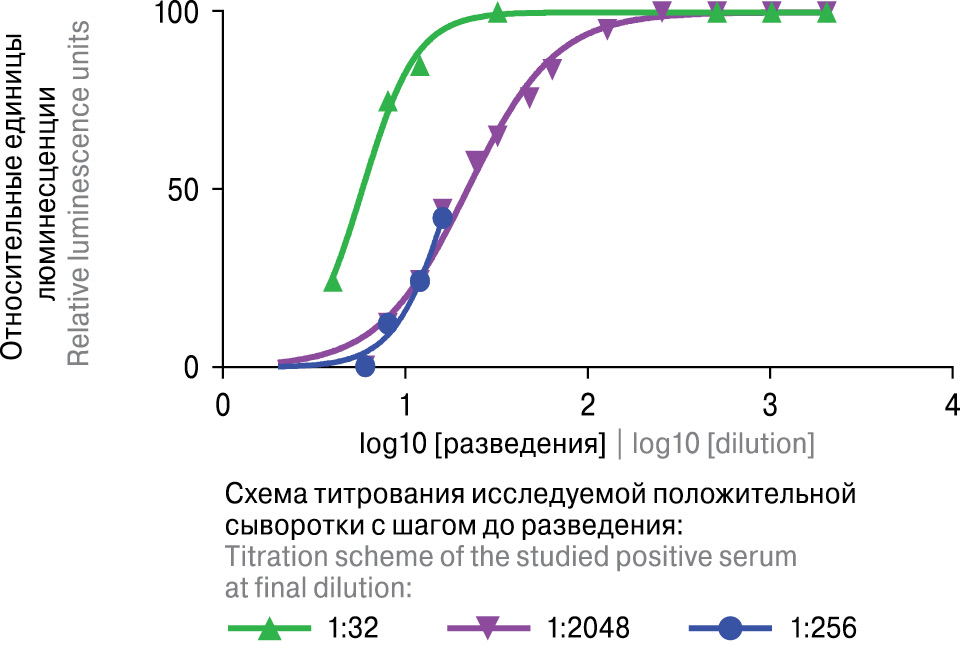 Наиболее применимыми в интерпретации результатов исследования сывороток являлись двукратные разведения образца до разведения 1:256. На рис. 4 показано, что исследуемый образец корректно титруется именно при данной схеме разведения, образуя оптимальную сигмоидальную кривую и демонстрирует наличие в исследуемой сыворотке ВНА. При использовании схемы разведения до 1:32 показано, что исследуемый образец титруется некорректно, что демонстрирует характерная сигмоидальная кривая. При использовании схемы разведения до 1:2048 сигмоидальная кривая была выставлена более корректно, но пороговое значение определялось менее точно ввиду больших шагов разведения.