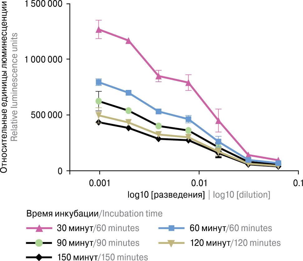 Было установлено, что оптимальное время инкубации планшета после внесения реагента OneGlo Promega (определяющего наличие люциферазы FLUC) — 60–75 мин. При таком сроке инкубации определялось максимальное количество люциферазы в лунке. Краситель распределялся равномерно, что препятствовало гетерогенности результатов. При этом в течение указанного времени определялось значительное для детекции количество люциферазы в лунке (1,5–2 млн единиц люминесценции).