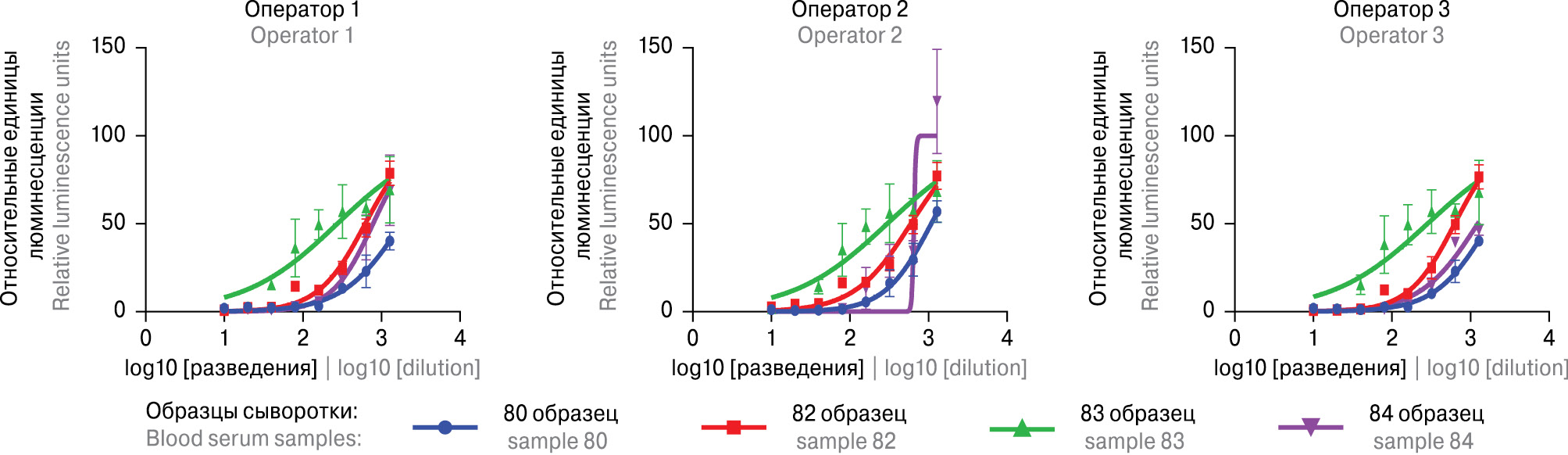 Табл. 7 и рис. 10 (вклейка, с. III) демонстрируют, что применение одного репортера разных серий, используемых при сборке псевдотипированной конструкции, не приводит к снижению устойчивости метода: CV ВНА в значении ID50 не превышает 55%, что соответствует критериям приемлемости методики. Робастность методики была подтверждена.