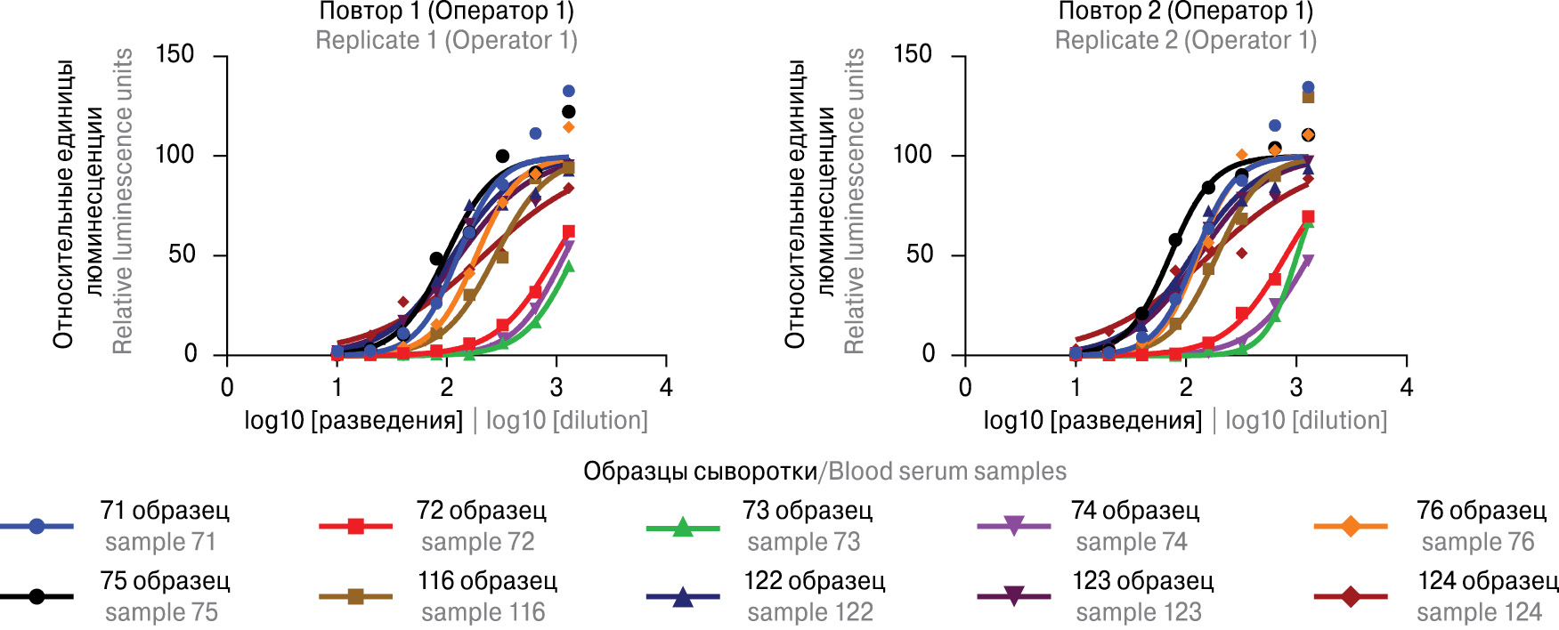 По результатам первой постановки было показано, что ВНА, содержащиеся в исследуемых положительных сыворотках, способны к нейтрализации спайкового белка на поверхности применяемых псевдовирусных частиц. Тем самым, проникновения псевдовируса в клетку за счет взаимодействия фермента ACE2 c S-белком на клетках HEK-293T-hAce2 не происходит и ген люциферазы FLUC не встраивается. При снижении уровня вируснейтрализующих антител в образцах повышается уровень люминесценции исследуемых образцов — сигнал более 2 500 000 RLU.
