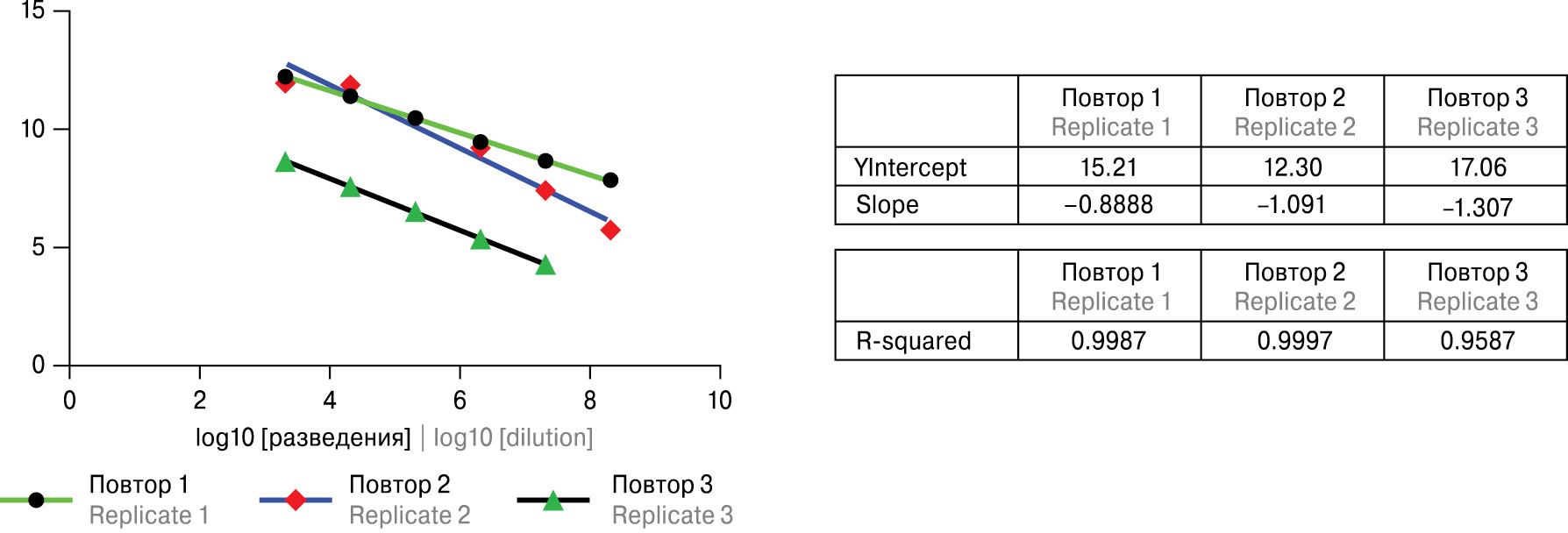 Линейность. Линейность методики — это наличие линейной зависимости аналитического сигнала от концентрации или количества определяемого вещества в анализируемой пробе в пределах аналитической области методики. В диапазоне детекции должна наблюдаться линейность при сопоставлении расчетного ID50 и измеренного ID50. Меру линейности определяют, откладывая на графике точки log2 (ID50) от log2 (кратность разведения) и находя R2 при линейной регрессии (функция y = kx + c). За допустимый уровень линейности принят такой, при котором R2 > 0,9.