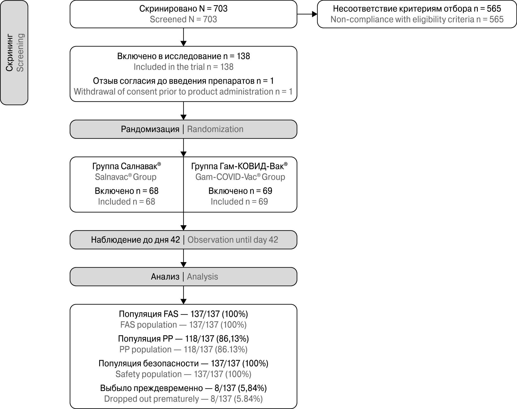 Профиль исследования. На момент проведения промежуточного анализа в исследование было скринировано 703 добровольца, 138 из которых (19,63%) соответствовали всем критериям включения/невключения и были рандомизированы в две группы вакцинопрофилактики. Один из рандомизированных добровольцев отозвал информированное согласие до введения Компонента I вакцины, что было расценено как ошибка рандомизации. Полную анализируемую совокупность (Full Analysis Set, FAS) составило 137 добровольцев. Из 137 рандомизированных добровольцев 19 пациентов были исключены из популяции «по протоколу» (Per Protocol, PP), и их данные не учитывались при анализе иммуногенности. Среди причин исключения из анализа были заболевание COVID-19 (для 7 добровольцев) и значимые отклонения от протокола с воздействием на результаты исследования (для 12 добровольцев) (рис. 1).