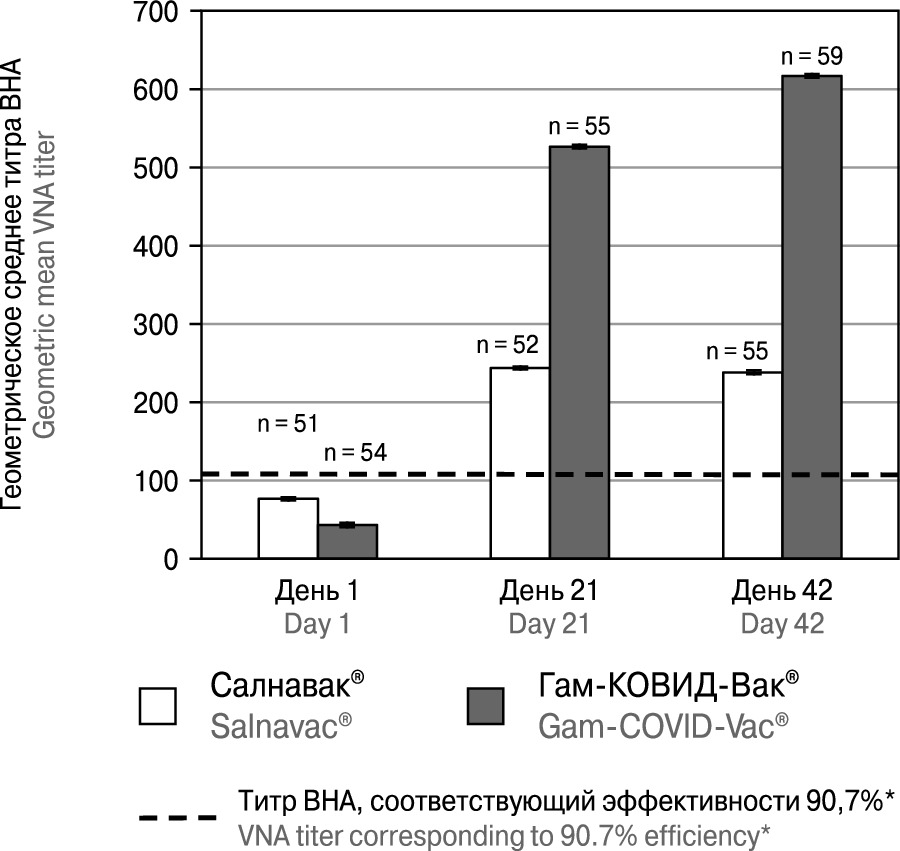 Учитывая применение сопоставимых методов определения ВНА в клиническом исследовании VCI-COV-III и при изучении препарата mRNA-1273 (Moderna, США), можно сделать предварительное заключение о достаточной протективной активности препарата Салнавак®.