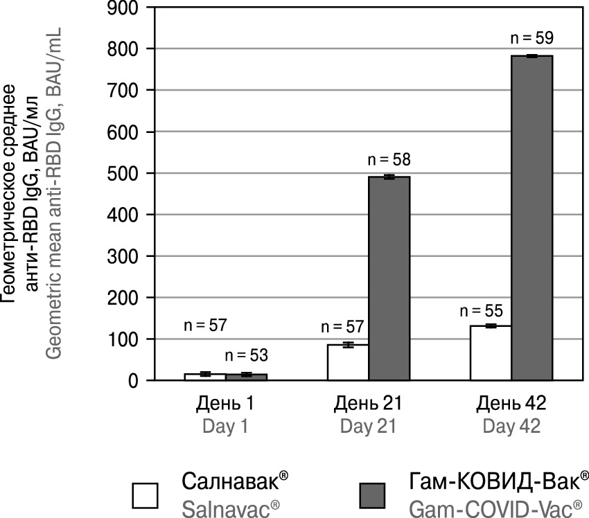 Переменные интереса исследования. Первичной переменной интереса является иммунологическая эффективность вакцины Салнавак® относительно вакцины Гам-КОВИД-Вак®, выраженная в соотношении средних геометрических титров ВНА против SARS-CoV-2 на 42-й день. Титр RBD-специфичного IgG против SARS-CoV-2 на 42-й день является одной из вторичных переменных.
